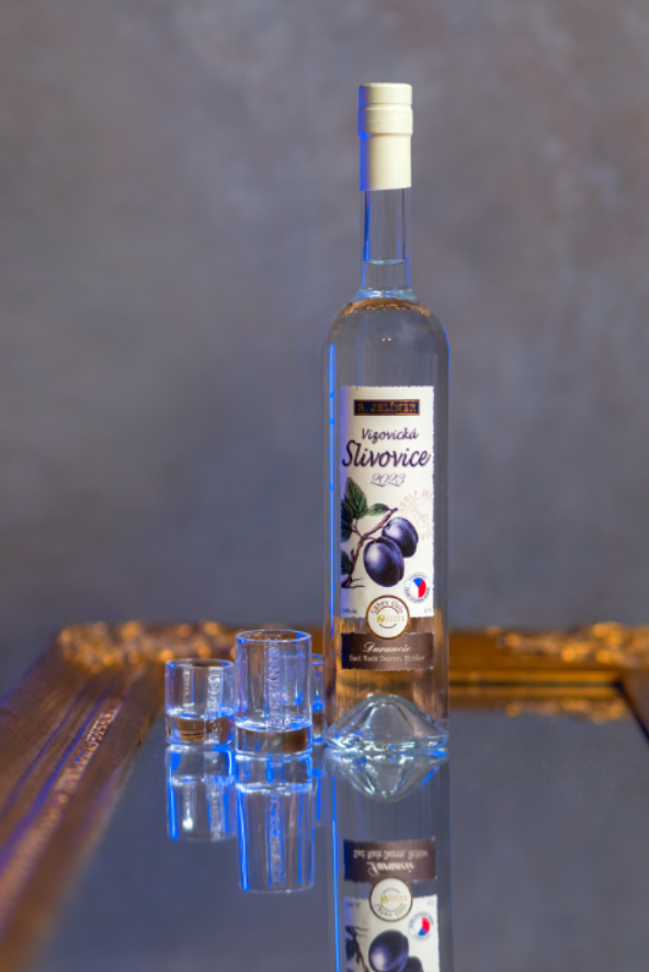 1x zlatá Vizovická slivovice 2023 50% 0,7l - připravená převážně z odrůd Čačanská rodná a Durancie, pocházejících z vlastního vizovického sadu.