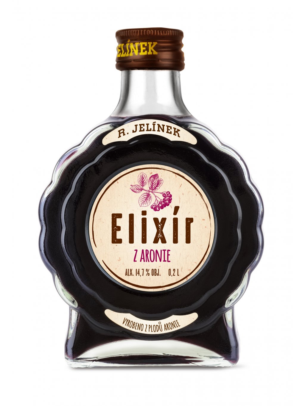 Elixír z aronie je druhý v řadě elixírů. Má rubínově červenou až temně fialovou barvu a díky použití původní suroviny a pečlivé přípravě si i po zpracování uchová vysoký obsah cenných látek, především vitamínu C a P. Šťáva z aronie, která se lidově nazývá černý jeřáb, je silným antioxidantem. Snižuje únavu a celkové vyčerpání organismu, zlepšuje paměť a posiluje imunitní systém.