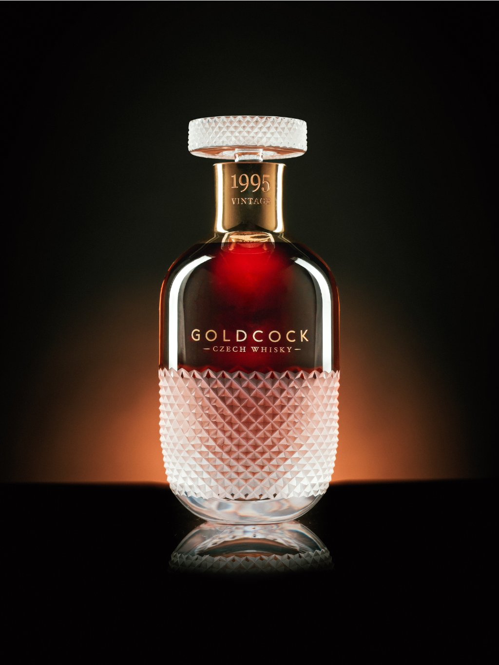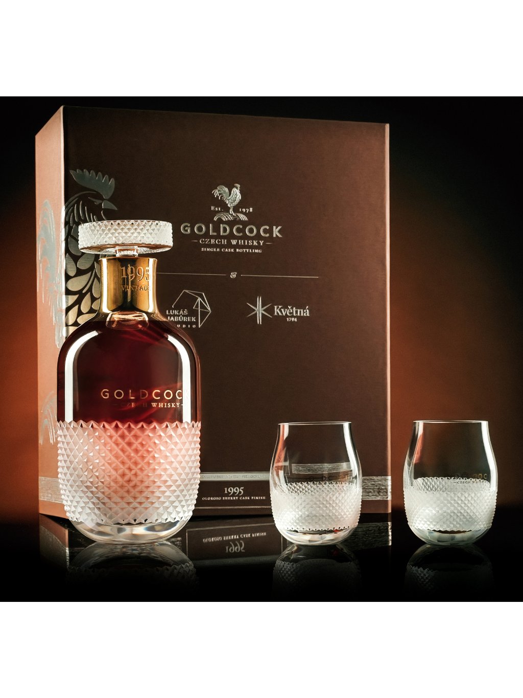Tento exkluzivní destilát jsme spojili s neméně výjimečnou formou. Naplnili jsme jej do exkluzivní karafy, která je sama o sobě uměleckým dílem. Křišťálová láhev a sklenice, navržené renomovaným designérem Lukášem Jabůrkem a vytvořené ve sklárně Květná 1794, nejstarší nepřetržitě fungující sklárně na Moravě, v sobě spojují tradici s moderním citem pro detail. Každý kus je ručně foukaný, zdobený pískováním a zlatem, a korunovaný unikátní zátkou broušenou diamantovým brusem, nesoucí logotyp se symbolem kohouta. GOLDCOCK 1995 není pouhou whisky. Je to pocta českému palírnickému umění, moravskému sklářství a současnému designu. Je důkazem, že pravý luxus vzniká z trpělivosti, řemeslné zručnosti a vášně, která dává každému detailu smysl i duši.