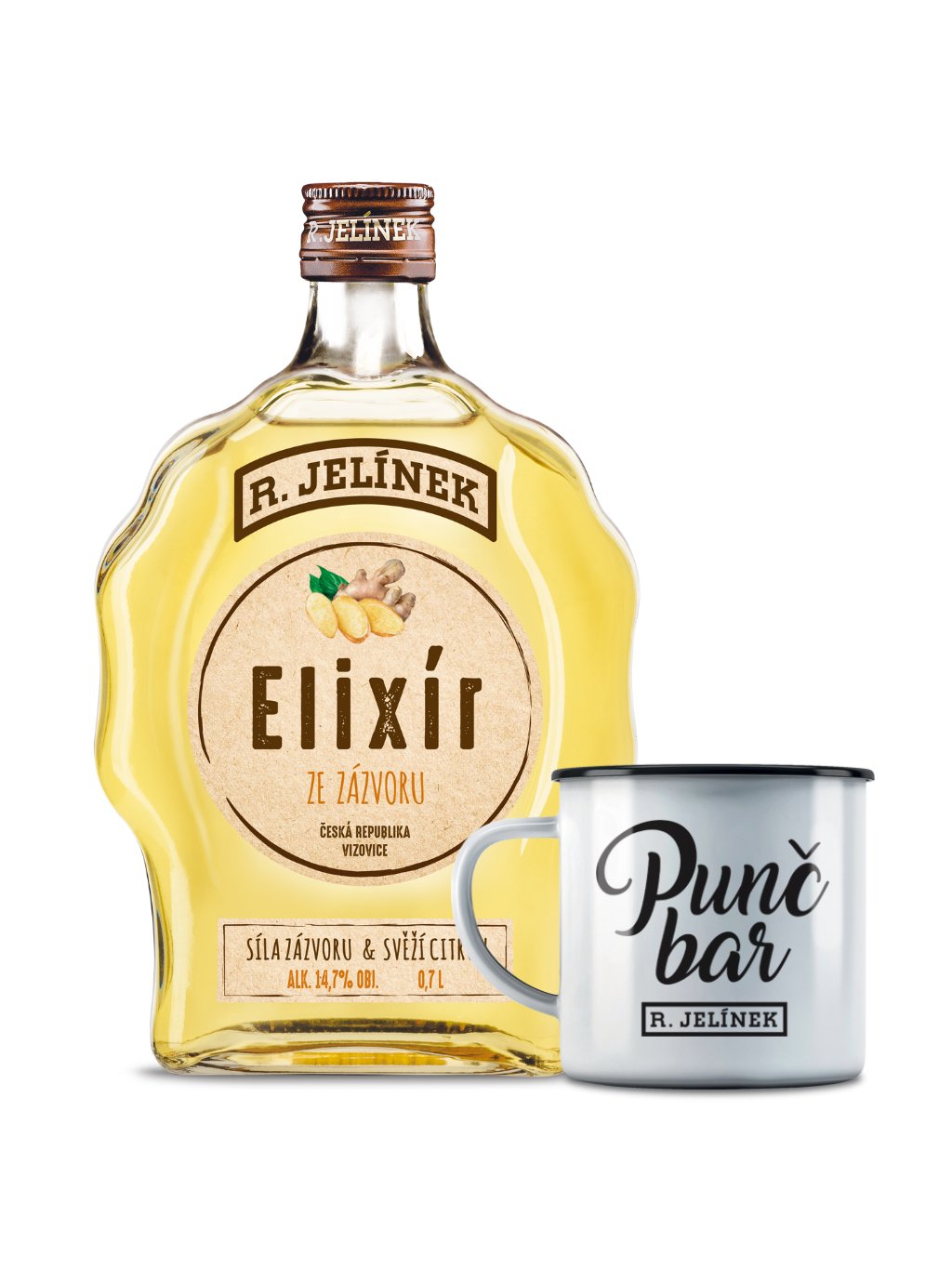 Velký panák Elixíru ze zázvoru zalijte přibližně deci a půl horké vody, přidejte citron, čerstvý zázvor a nápoj je hotový. Podávejte ve stylovém plecháčku Punč bar R. JELÍNEK.