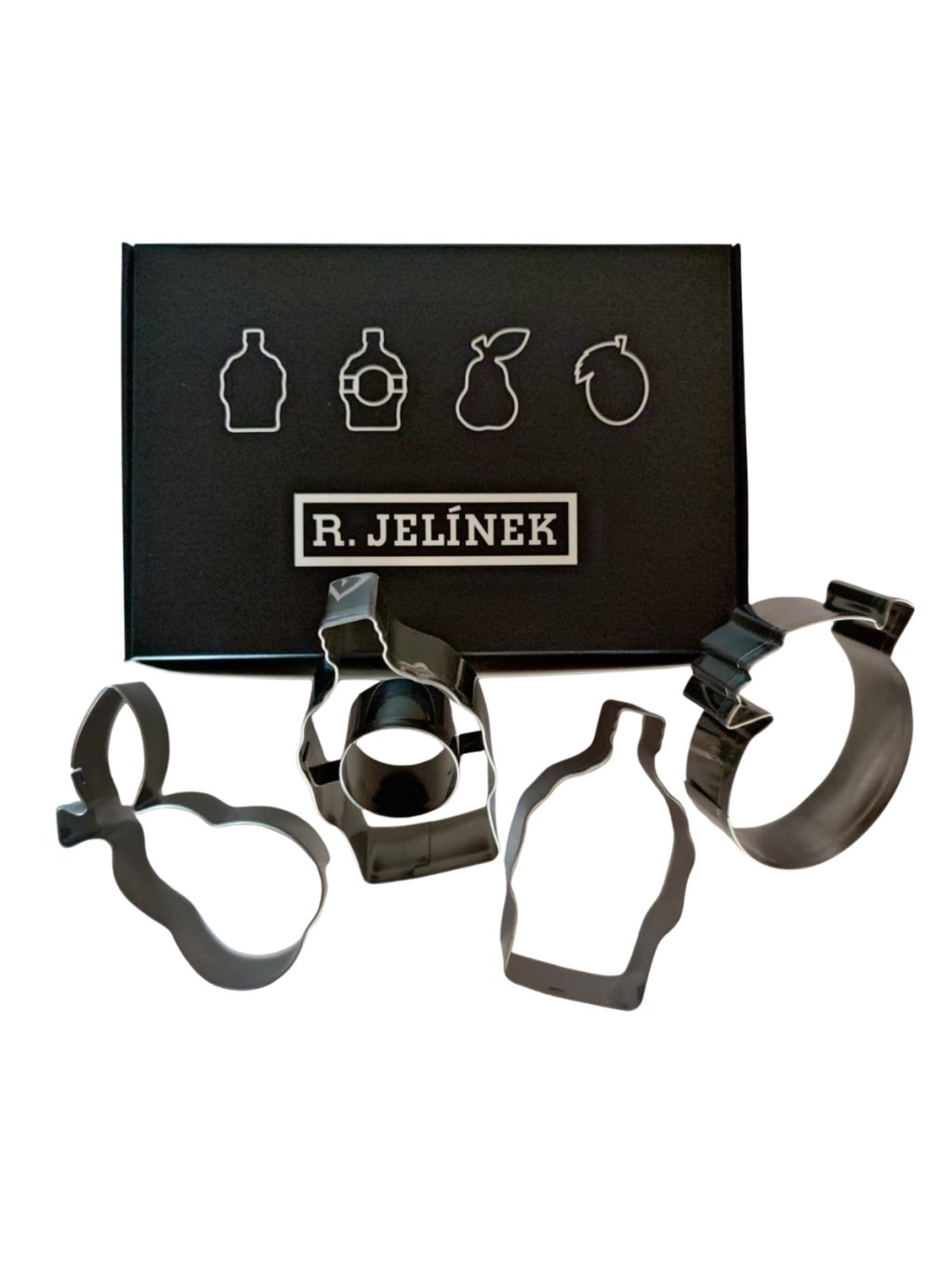 Set 4 vykrajovátek R. JELÍNEK. Motivy: budík, budík s etiketou, hruška, švestka.